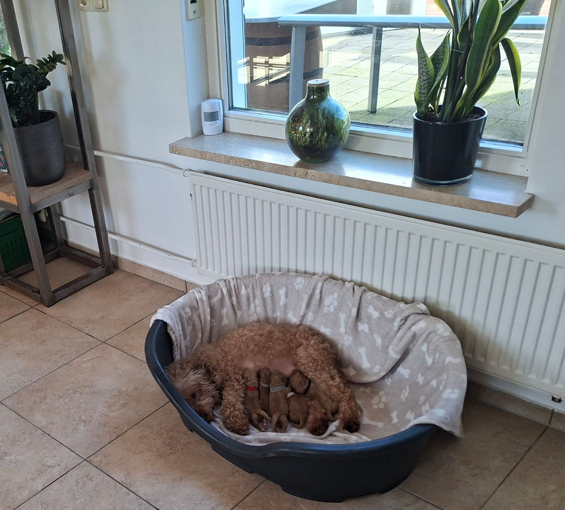 De pups groeien bij ons in de woonkamer op en om ze hier goed te kunnen socialiseren en te laten wennen aan alle dagelijkse huishoudelijke geluiden zoals de stofzuiger, verschillende mensen, kinderen en andere honden.