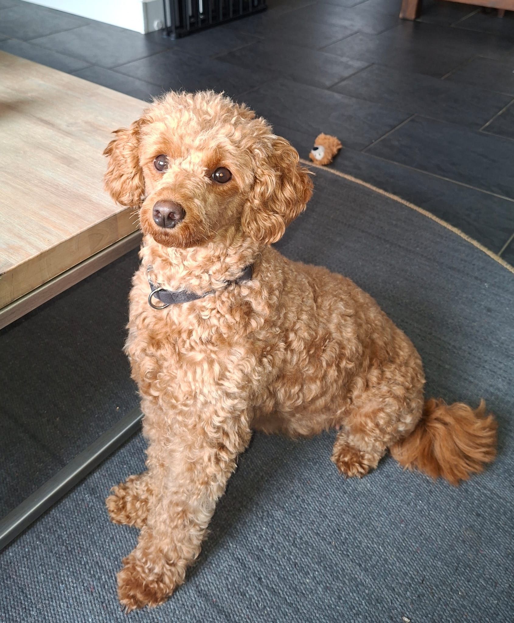 Dit is Pinda, een mini labradoodle van ca. 32 centimeter schofthoogte en een gewicht van 5 kilo. Ze heeft een heel fijn, zacht en lief karakter. Ze voelt precies aan wat haar baasjes nodig hebben. De labradoodle past goed binnen mijn visie omdat deze ook niet verharend en hypoallergeen is. Doordat ik een keer terugkruis met de poedel (Cody) is een stabiele vacht en een hoge intelligentie gegarandeerd.